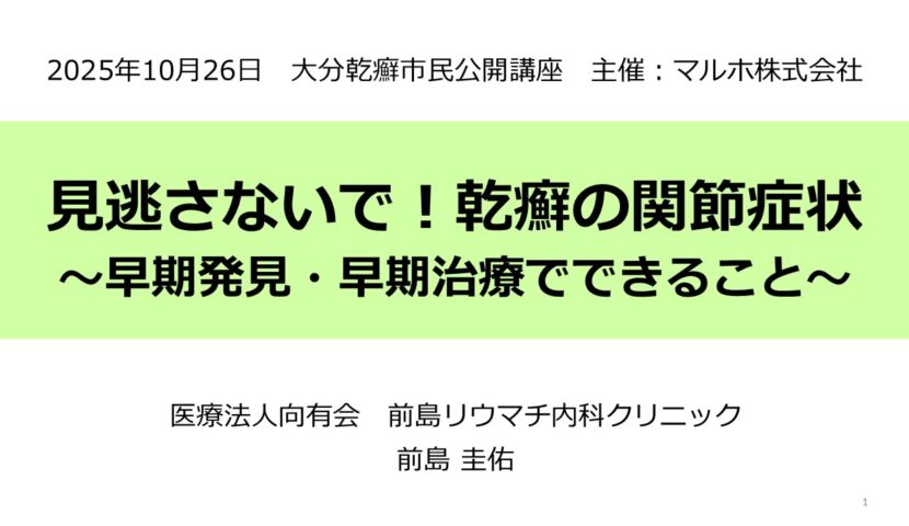 当日は、大分大学医学部皮膚科学講座の後藤瑞生先生による「乾癬ってどんな病気」というご講演に続き、私がリウマチ専門医の立場から「見逃さないで!乾癬の関節症状 ~早期発見・早期治療でできること~」というテーマでお話しさせていただきます。